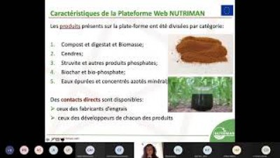 Le webinaire (6 mai 2021) avait pour but d'informer les participants francophones sur le projet Nutriman et de présenter la plateforme des agriculteurs ainsi que des exemples de produits et de technologies qu'elle contient. En outre, c'était l'occasion idéale d'expliquer aux agriculteurs et aux spécialistes de terrain comment chercher et trouver les informations que la plateforme agricole Nutriman offre (par exemple, la possibilité de consulter des documents dans la langue locale, comment rester informé sur le projet, comment participer et donner leur avis grâce aux différents questionnaires fournis). Différents produits faisant partie des essais sur le terrain ont été présentés, en mettant l'accent sur le projet Nutriman (comme les cendres, le fumier solide, le compost, le biophosphate...). La situation concernant la réglementation de la fertilisation et du recyclage en Europe et en France a été présentée. En parallèle, le nouveau règlement européen 1009/2019, qui sera appliqué à partir de juillet 2022, a été expliqué en détail. Enfin, les résultats des tests de produits éco-durables tels que les cendres, le fumier solide et le compost ont été présentés.